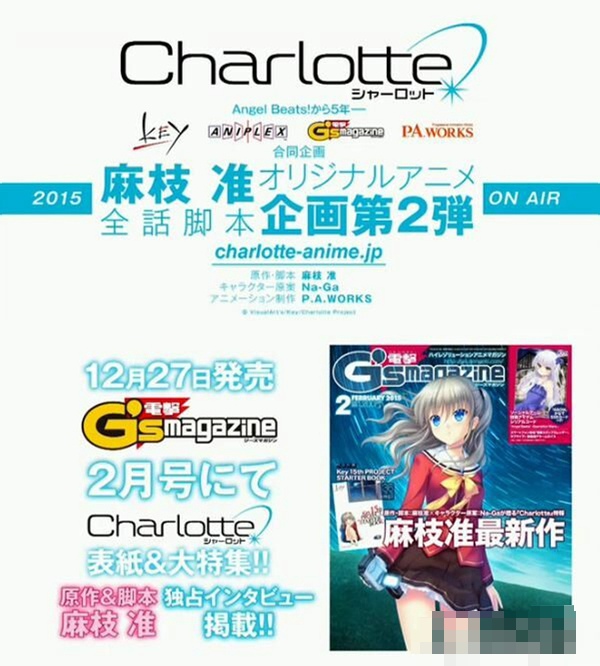 Aniplex与Key的合作继前作「AngelBeats」后,于今日niconico发布会上公开了新企划——新作TV动画「charlotte」(シャーロット)!这部动画将由「angelbeats」制作团队的核心人物再度联手制作,麻枝准负责全话脚本。目前动画已于今晚宣布了将于2015年进行放送预定的好消息!